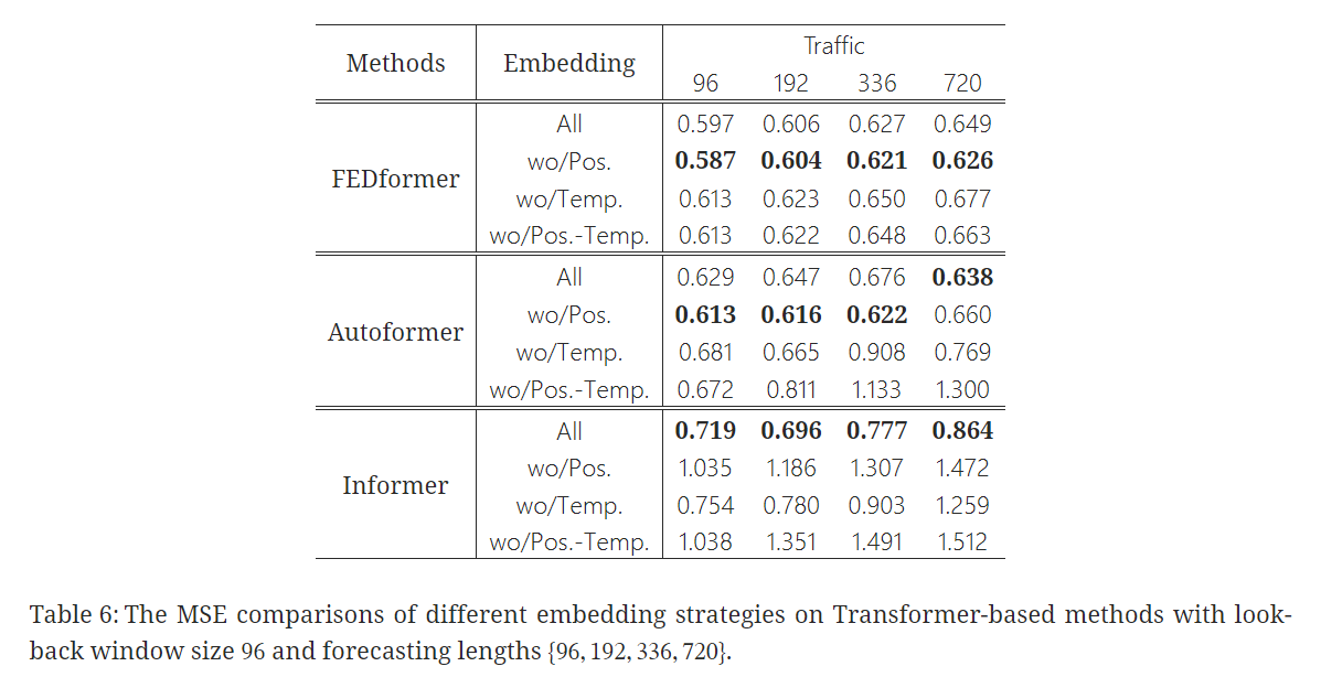 - FEDformer는 temporal inductive bias를 도입하기 위한 frequency-enhanced module 덕분에 position/timestamp embeddings을 제거해도 성능이 덜 하락