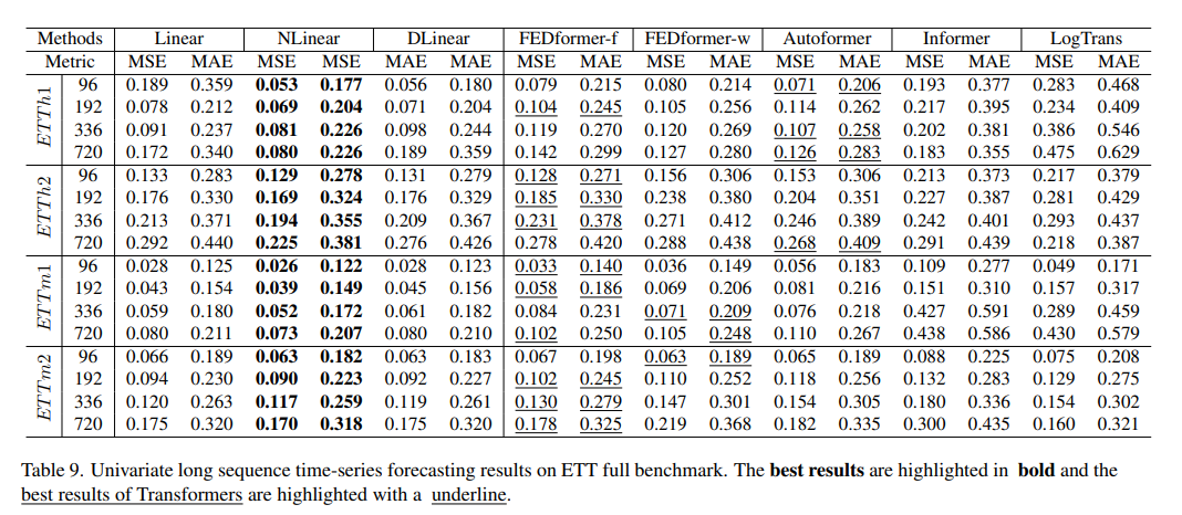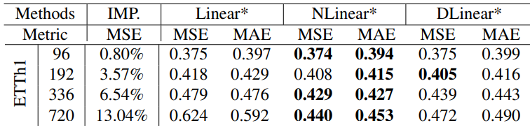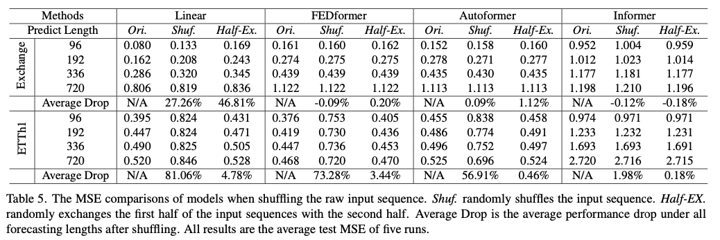 그 결과 Transfomer 모델의 성능의 약간의 감소를 확인 가능한데, 이는 데이터 셋에서 인접한 시계열 순서에서만 포착하는 것이 아닌지 의문을 준다. 또한 이는 적은 수의 매개변수만으로도 주기성 등 정보를 포착하는데 충분하다는 것을 보여주며 Transfomer의 과적합 문제를 제기한다.
