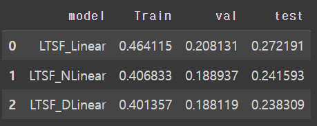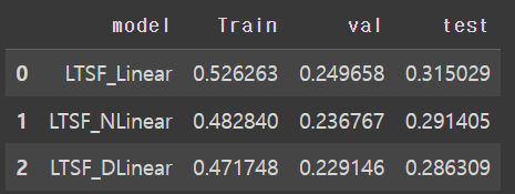 MSE 결과는 다음과 같다. 보면, MAE가 매우 크긴 하지만 DLinear > NLinear > Linear 가 성능이 좋음을 확인 가능하다.