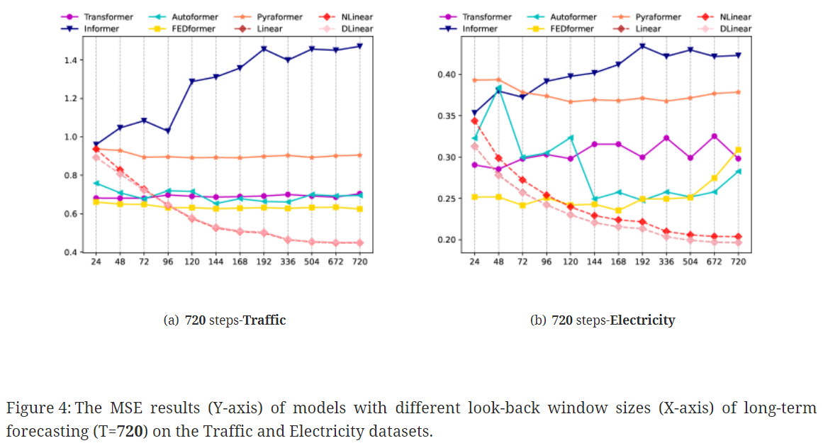 👍 반면 LTSF-Linear 모델은 look-back windows sizes가 커짐에 따라 성능이 향상What can be learned for long-term forecasting?
