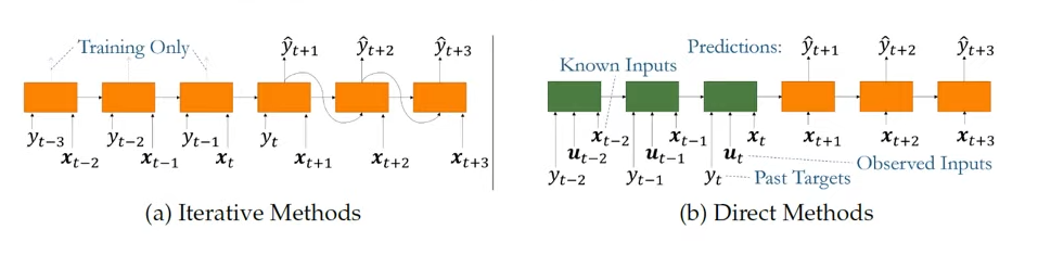 Lim Bryan and Stefan Zohren, "Time series forcasting with deep learning: a servey" Iterative Methods는 train data를 이용해서 다음 data를 순차적으로 예측하는 모델이다. 이때 예측한 결과값을 다음 예측에 동일하게 이용한다. 이런 경우 예측이 올바르지 않을 경우 뒤 부분의 예측이 모두 어긋나는 문제가 생기게 된다.