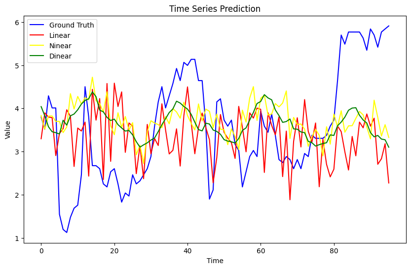 model_name = 'LTSF_Linear' model = LTSF_Linear( window_size=window_size, forcast_size=forcast_size, individual=False, feature_size=1, ) model.to(device) criterion = nn.MSELoss() optimizer = optim.Adam(model.parameters(), lr=lr) train_loader = DataLoader(train_ds, batch_size=batch_size, shuffle=True) valid_loader = DataLoader(valid_ds, batch_size = batch_size, shuffle=False) test_loader = DataLoader(test_ds, batch_size=batch_size, shuffle=False) train_loss_list = [] valid_loss_list = [] test_loss_list = [] if __name__ == '__main__': best_val_loss = float('inf') since = time.time() print(f'Training Model on {device}\n{"=" * 44}') for epoch in range(1, epoch_size+1): epoch_start = time.time() train_loss = train(epoch) train_loss_list.append(train_loss) m, s = divmod(time.time() - epoch_start, 60) print(f'Training time: {m:.0f}m {s:.0f}s') val_loss = valid() valid_loss_list.append(val_loss) # Early stopping 체크 if val_loss < best_val_loss: best_val_loss = val_loss early_stop_counter = 0 torch.save(model.state_dict(), f'best_{model_name}_model.pth') # 현재 가장 좋은 모델 저장 else: early_stop_counter += 1 if early_stop_counter >= patience: print("Early stopping!") break test_start = time.time() model.load_state_dict(torch.load(f'best_{model_name}_model.pth')) # 가장 좋은 모델로 복원 test_loss = test(model) m, s = divmod(time.time() - test_start, 60) print(f'Testing time: {m:.0f}m {s:.0f}s') m, s = divmod(time.time() - since, 60) print(f'Total Time: {m:.0f}m {s:.0f}s\nModel was trained on {device}!') result_list.append({"model": model_name,"Train": train_loss, "val": val_loss, "test": test_loss}) predict_Linear = predict_result(model) # 각 텐서를 numpy 배열로 변환하여 리스트에 저장 array_list = [tensor.detach().numpy() for tensor in predict_Linear] # 리스트 안의 모든 배열을 하나의 배열로 결합 predict_Linear = np.stack(array_list)결과