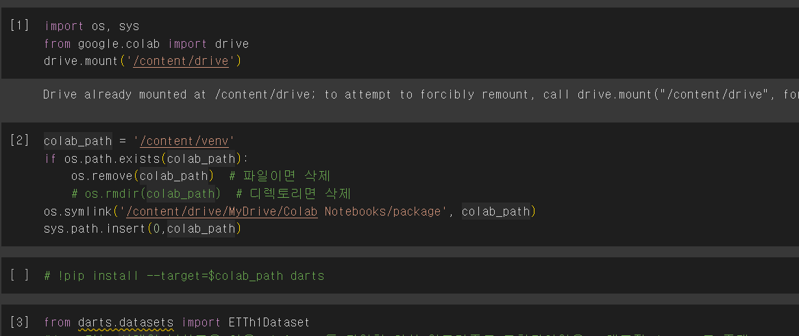 colab_path = '/content/venv' if os.path.exists(colab_path): os.remove(colab_path) # 파일이면 삭제 # os.rmdir(colab_path) # 디렉토리면 삭제 os.symlink('/content/drive/MyDrive/Colab Notebooks/package', colab_path) sys.path.insert(0,colab_path)결과는 아래와 같이 잘 된다..!