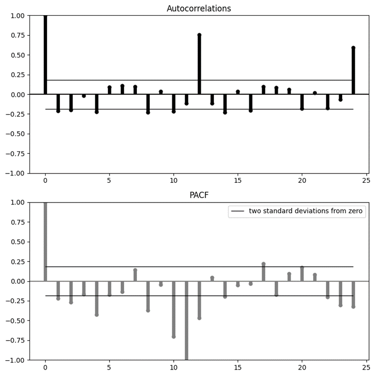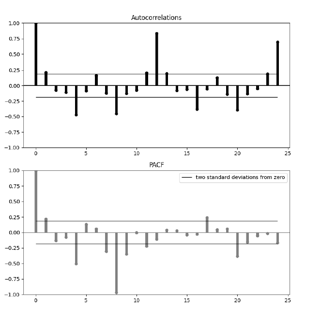 3. ACF: Significant spikes at lags 1, 12, and 24.