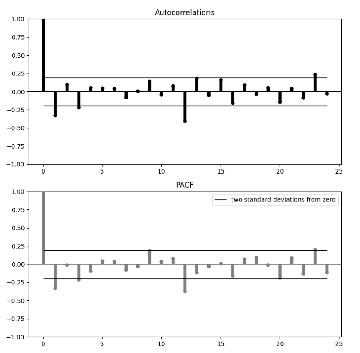 1. The ACF and PACF show us a cyclical(seasonal) pattern(12), which seems like they has seasonality