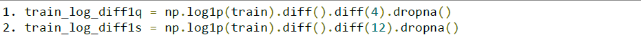 Fig 2: Plot of log transformed data and differences for log transformed data 보면 log 변환 전에 비해 꽤나 정상성을 띄는 데이터의 모습을 하고 있음을 확인 가능하다.