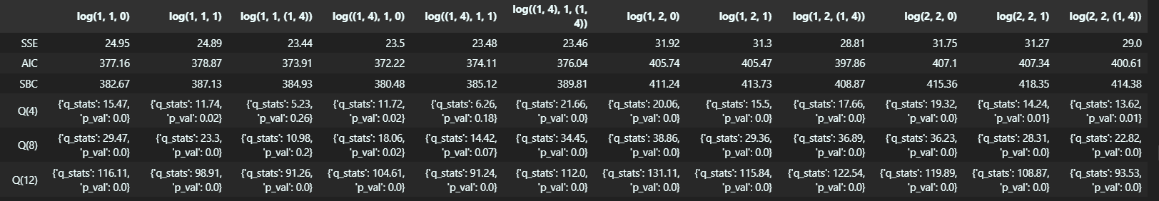최종적으로 위의 ACF, PACF 결과를 토대로 Ljung-Q statistic을 확인하여 최적의 모델을 찾으려고 한다.