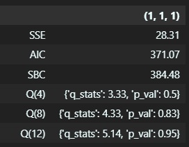 추가적으로 Sum of Squared Errors (SSE), Akaike Information Criterion (AIC), Schwarz Bayesian Criterion (SBC)도 고려하여 모델을 판단하였을 때 (1,1,0), (1,1,1) 후보를 선택했다.