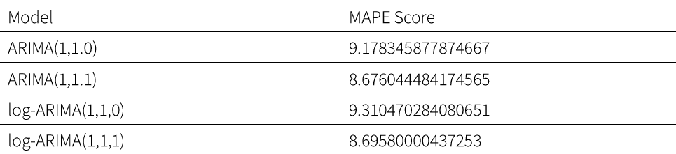결과를 토대로 ARIMA(1,1,1)과 (1,1,0) 모델을 선택하였다.