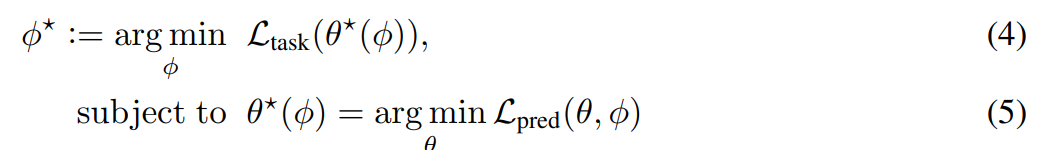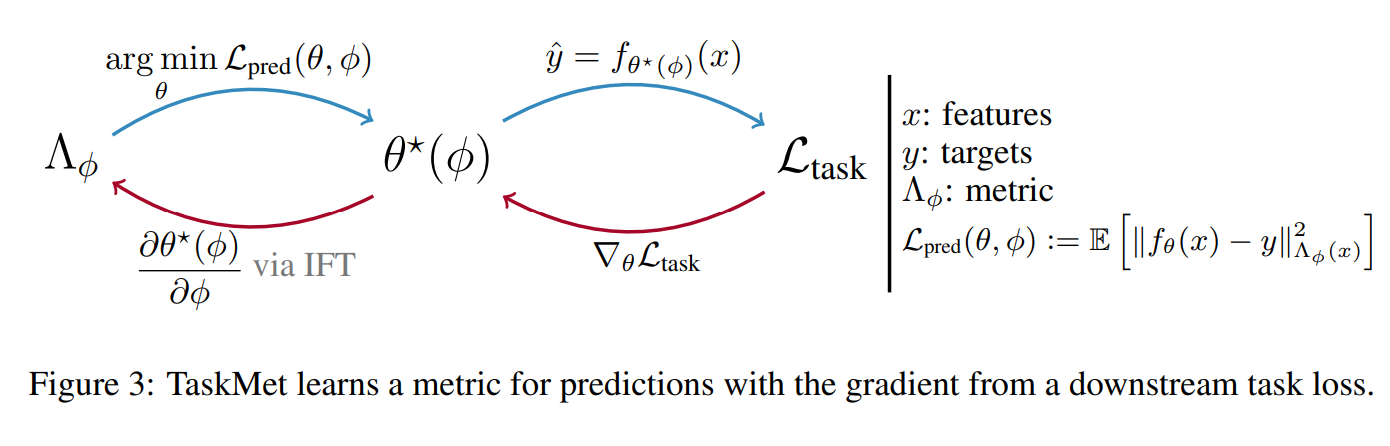 bilevel optmization 이때, 각 ϕ는 metric의 parameter이고, θ는 L pred로 부터 나오는 예측값(optimize unknown parameter)이다. 또한 task loss는 문제가 풀고자하는 optimization 문제에 따라 달라진다.