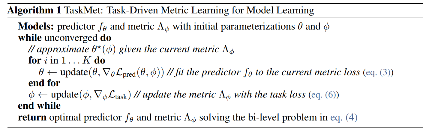 bilevel optmization 이때, 각 ϕ는 metric의 parameter이고, θ는 L pred로 부터 나오는 예측값(optimize unknown parameter)이다. 또한 task loss는 문제가 풀고자하는 optimization 문제에 따라 달라진다.