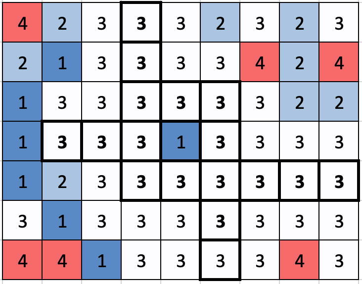 이 픽셀의 색은 4이므로, 색이 4이면서 (3,5)와 가로세로로 연결되어 있는 픽셀들을 선택하면 아래와 같고, 색을 3으로 바꾸면 다음과 같다.