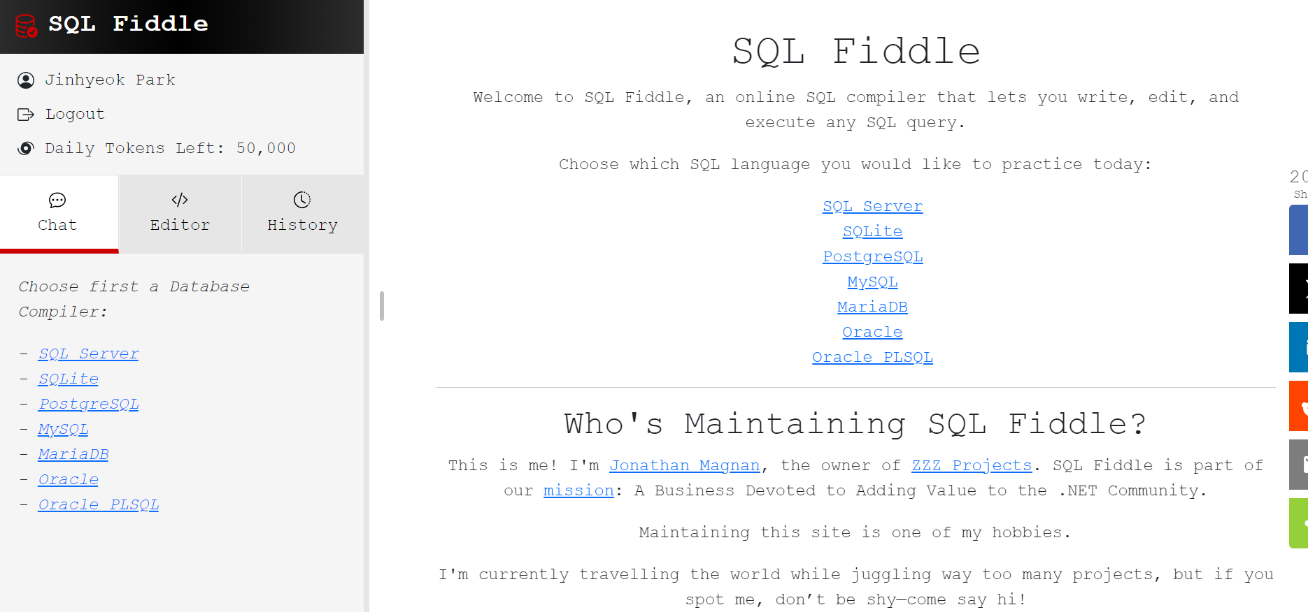 SQL Fiddle Welcome to SQL Fiddle, an online SQL compiler that lets you write, edit, and execute any SQL query. Choose which SQL language you would like to practice today: Who's Maintaining SQL Fiddle? This is me! I'm Jonathan Magnan, the owner of ZZZ Proje