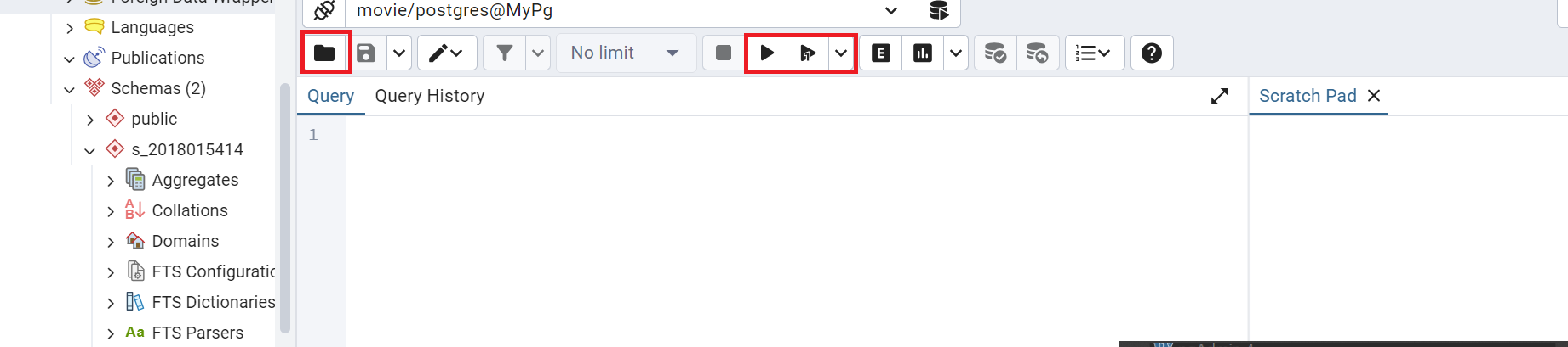 시작하면 아래와 같이 Query를 작성할 수 있는 새로운 칸이 열리고, 옆에 폴더를 클릭하여 기존 SQL을 불러온 뒤 play버튼 처럼 생긴걸 누르면 끝이다!! 조금더 편하게 볼 수 있도록 밑에 그림에 붉은색으로 박스를 쳐두었다