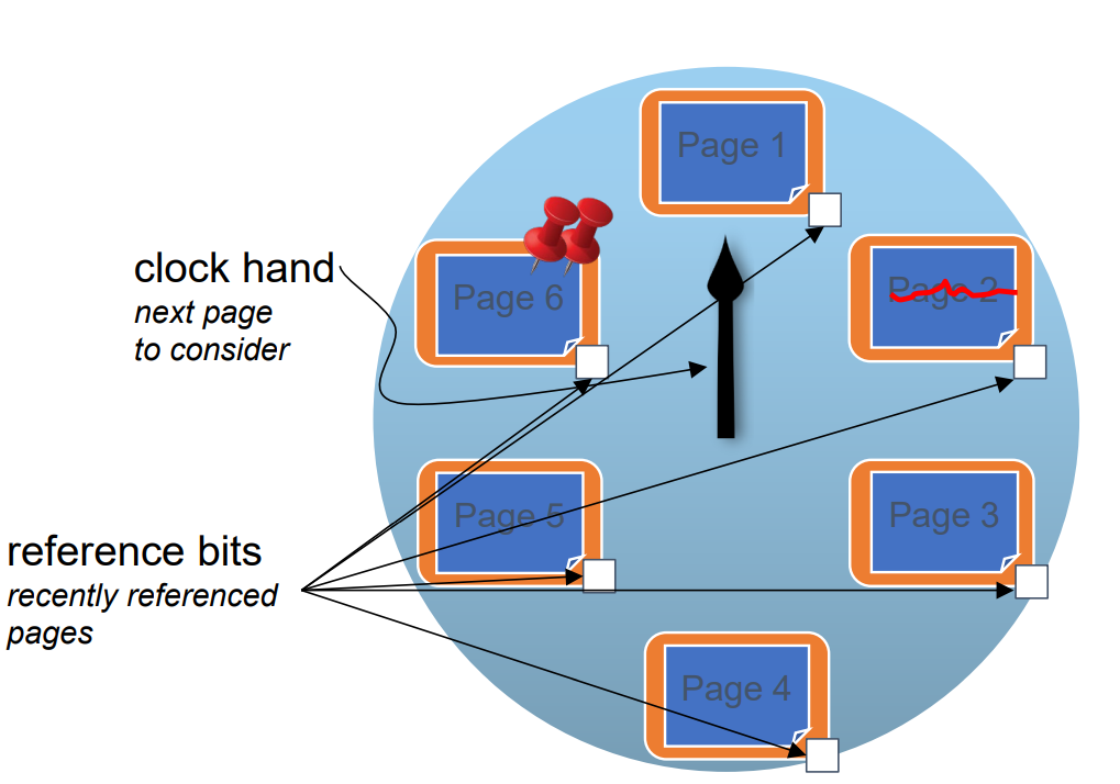 우선 Clock은 시계바늘로 다음에 교체할 페이지를 가리키고 있다. 또한 각 프레임의 reference bits는 가장 최근에 참조된 페이지를 말한다.