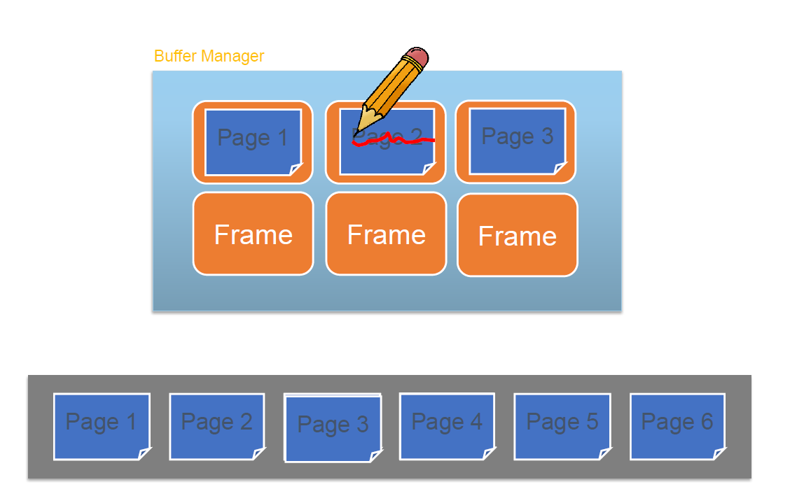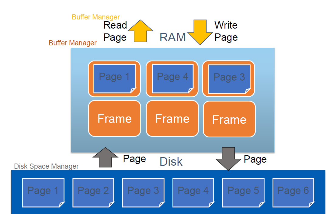 최근 접근된 페이지들을 메모리(프레임)에 담아두고, 해당 페이지가 다시 접근되면 Disk까지 갈 필요 없이 버퍼 프레임에서 바로 꺼내줄 수 있도록 합니다. 이때 프레임은 버버에서 다루는 페이지와 동일한 의미로 생각하면 된다.프레임: 프레임은 버퍼를 구성하는 단위이다.