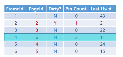 버퍼 매니저에서 프레임은 테이블처럼 관리되며, 페이지 아이디와 Dirty flag, pin count를 통해 관리된다.