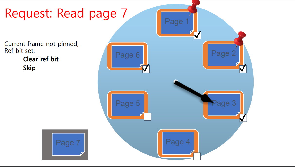 1. page 7을 찾는 경우 우선 핀이 없는 페이지를 시계바늘 순서대로 찾아가다가