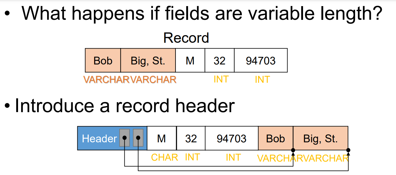 결론은 위의 그림에서와 같이 헤더를 따로 생성하고 각 헤더에서 각 필드의 마지막 위치를 가리킨다. 또한 가변길이 필드는 길이가 변해야하기 때문에 고정길이 필드가 앞에 먼저 오게 되고, 이후에 가변 길이 필드가 저장된다.