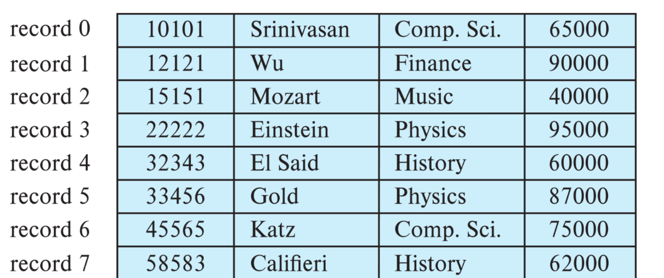 File은 Record들의 집합(Sequence)이고, Record는 각 Field로 구성되어 있다(Record를 tuple로 field를 각 attribute라고 생각하자)