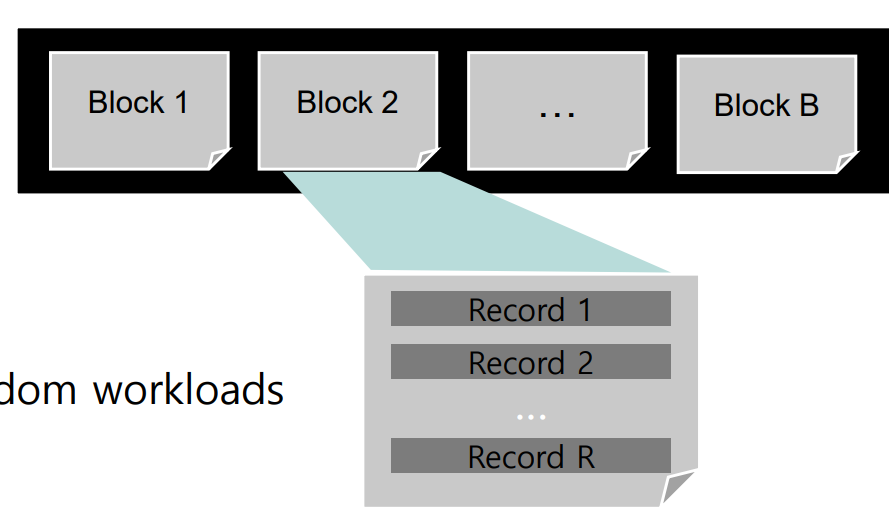 - 연산 단위: 평균적으로 블록 읽기/쓰기 비용만 고려(메모리 작업 비용 제외)