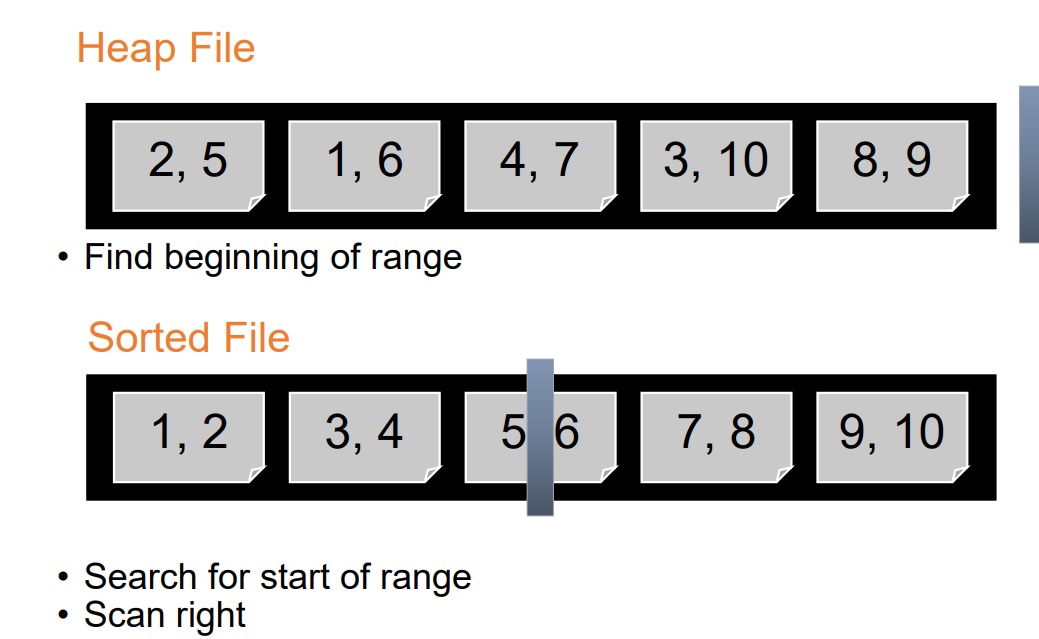 - Sorted Files: order 혹은 특정 range of record가 있을 때 유리