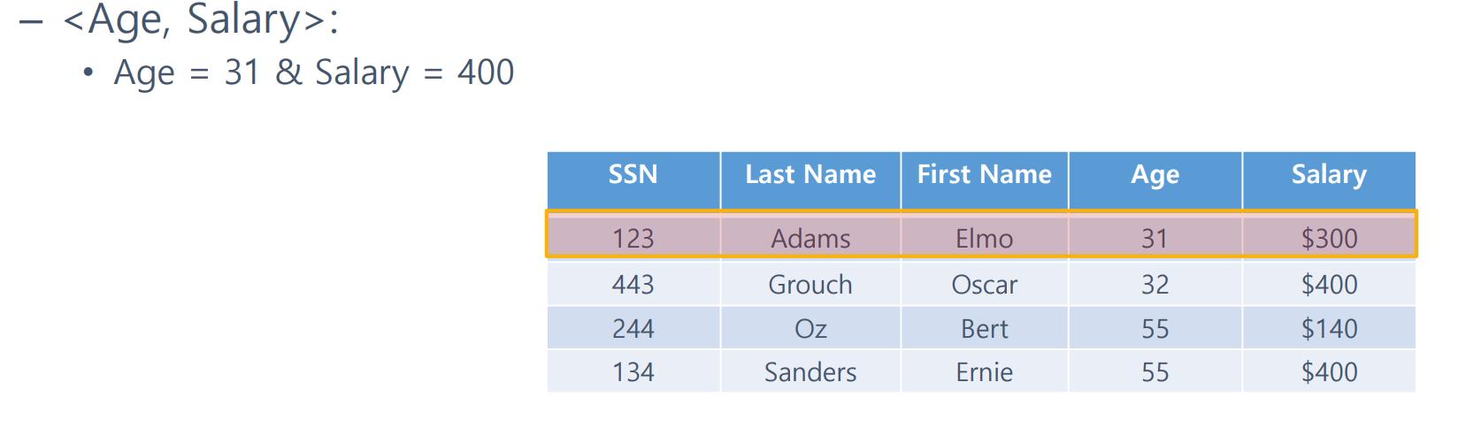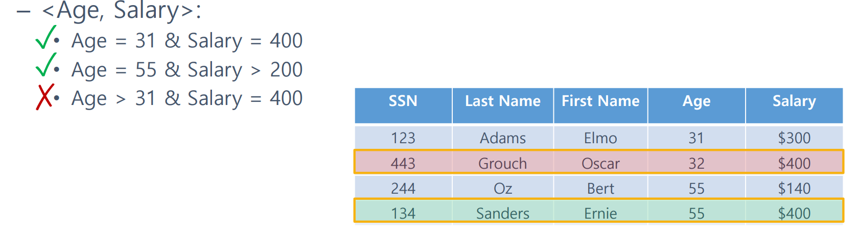 <AGE, SALARY>에 관한 복합 인덱스가 있다고 가정하자.