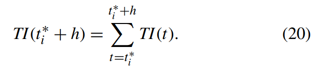 본 연구에서는 시간 시계열의 미래 방향을 예측하는 단기 미래 추세 지표를 활용한다. 단기 미래 미래 시간 지평 h에 관한, t~t+h까지의 누적 추세 지표값인 TI는 다음과 같이 정의됩니다