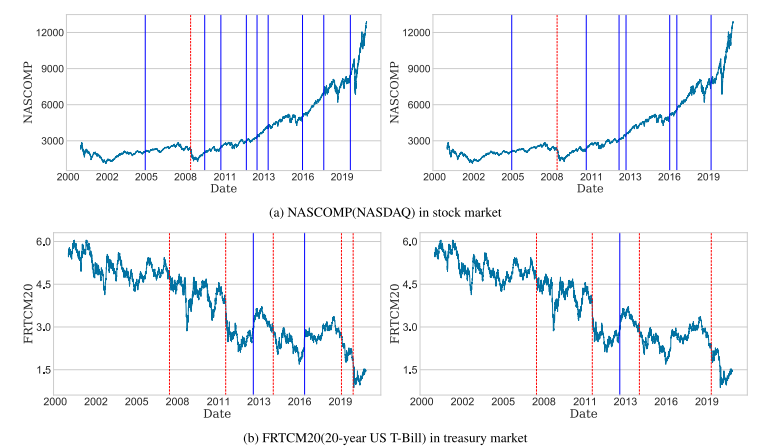 FIGURE 4. Representative cases of the detected CPs of AIT-ICSS (left) and KW-ICSS (right) for different financial sectors. 일반적으로, KW-ICSS는 AIT-ICSS보다 탐지된 CP의 개수가 적어 과대탐지 현상이 줄어드는 경향을 보였다.