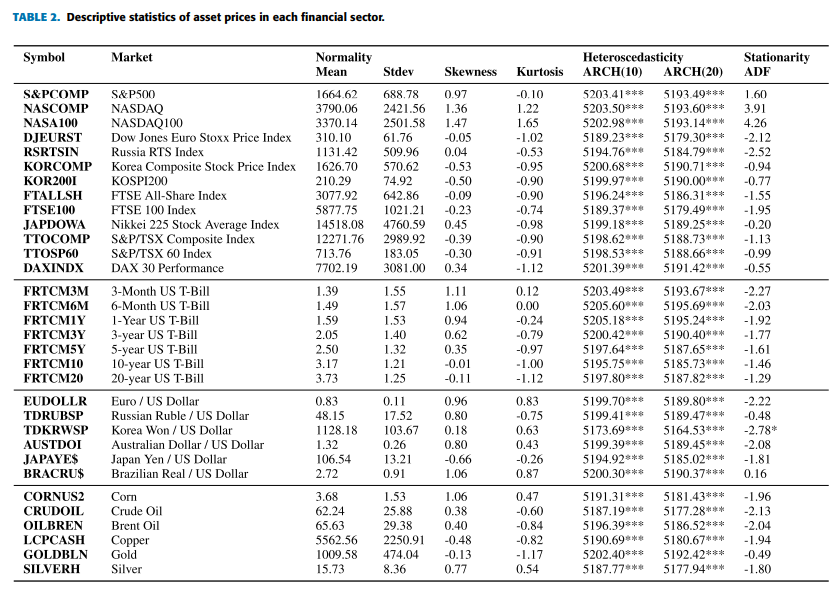 실제 금융 시계열의 CP의 정확한 위치는 알려져 있지 않다. 그러나 간접적인 검증을 통해 CP의 존재 여부를 확인할 수 있다. 예를 들어, 구조적 변화가 발생하면 시계열 데이터는 정규 분포를 따르지 않을 수 있으며, 이는 시간에 따른 추세 변화 또는 분산 변화를 의미할 수 있다. 이러한 맥락에서, 기술 통계를 검토하고, 정규성(normality), 이분산성(heteroscedasticity), 정상성(stationarity) 검정을 수행하였으며, 결과는 Table 2에 요약되었다.먼저, 각 부문의 평균과 분산이 다르며, 대부분의 시장이 양의 왜도(skewness)를 가진 것으로 나타났다. 또한, 대부분의 시장은 0이 아닌 첨도(kurtosis) 값을 가지므로 비정규(Gaussian) 분포를 따르지 않는 것으로 확인되었다.