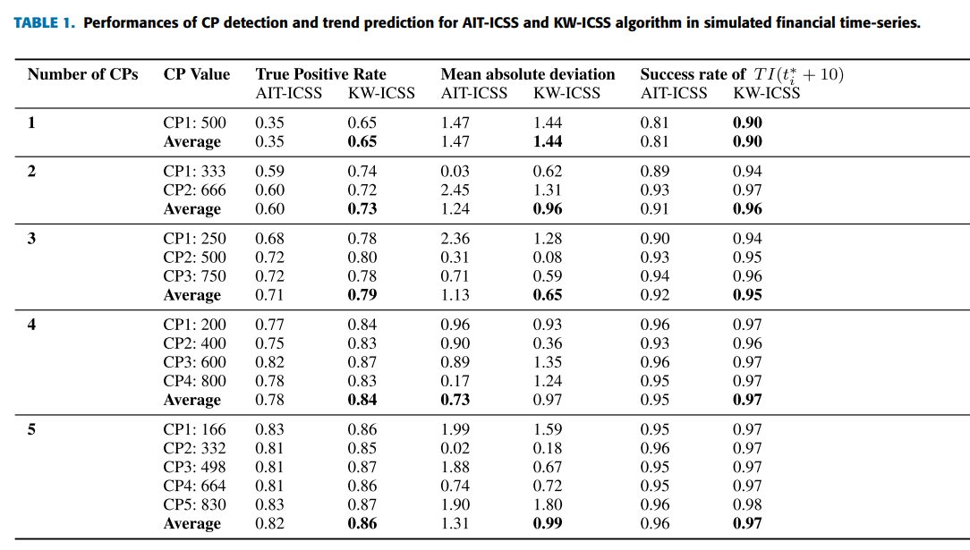모의 금융 시계열(변화점의 실제 위치가 알려진)에서, KW-ICSS는 다양한 변화점 개수에 대해 평균 81%의 True Positive Rate을 기록한 반면, AIT-ICSS는 72.57%를 기록하였습니다. 또한 KW-ICSS는 서로 다른 유의 수준에서 실제 변화점과 탐지된 변화점 간 평균 절대 편차(Mean Absolute Deviation, MAD)가 AIT-ICSS보다 적었습니다. 실험 결과, 모델 파리미터 중 유의 수준(signifcance level)은 10% 미만으로 설정하는 것이 적절함을 발견할 수 있었습니다.