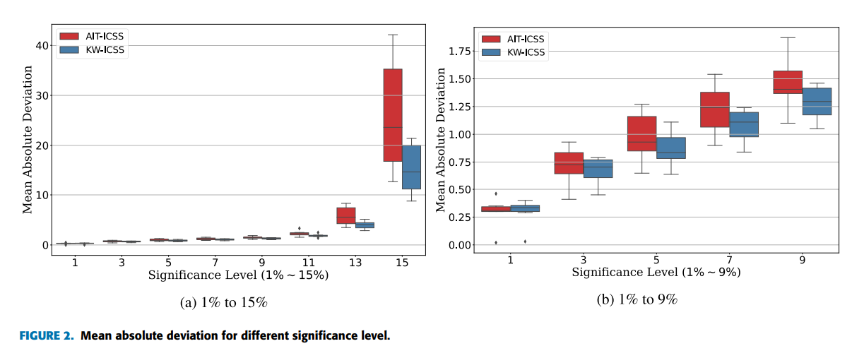 일반적으로, 유의 수준이 증가할수록 MAD도 증가하는데, 이는 높은 유의 수준에서 CP가 과대평가될 위험이 있음을 나타낸다. 두 알고리즘 모두 11% 이상의 유의 수준에서 MAD가 눈에 띄게 증가하므로, 정확한 CP 탐지를 위해 유의 수준을 10% 이하로 유지하는 것이 바람직하다. 또한, 모든 유의 수준에서 KW-ICSS가 AIT-ICSS보다 우수한 성능을 보였다.