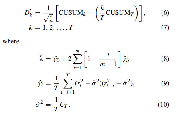 기존 연구에서는 D를 이용한 CP 추정이 정규 분포를 따르지 않는 데이터(non-normal distribution data)에서 첨도(kurtosis)가 크고 조건부 이분산성이 존재할 경우 효과적이지 않음을 보였었다( A. Sansó, ‘‘Testing for changes in the unconditional variance of financial time series,’’ Revista Economía Financiera, vol. 4, no. 1, pp. 32–53, 2004). 이를 해결하기 위해 바틀렛 커널(Bartlett kernel)을 기반으로 한 비모수적(non-parametric) 통계량을 적용한 변형된 D' 가 아래와 같이 제안되었다.