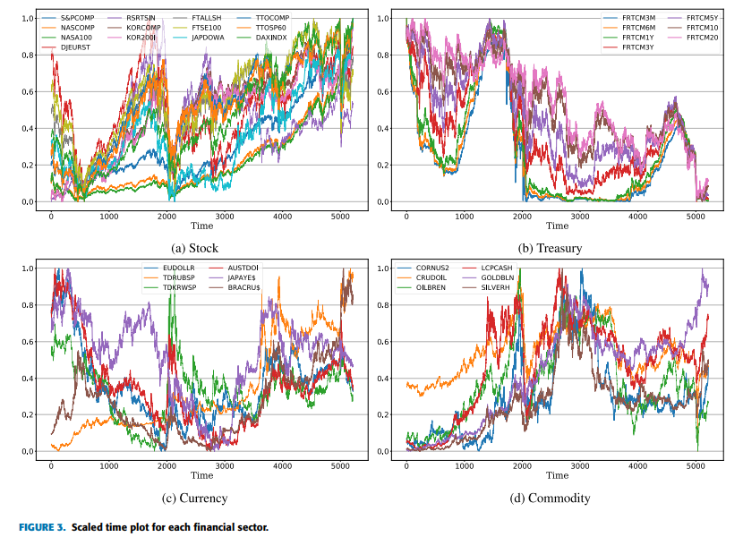 Figure 3은 min-max 스케일링을 적용한 전체 금융 시계열을 나타낸다. 결과에 따르면, 각 시장은 서로 다른 움직임과 구조적 변화를(즉, CPs가 존재) 보인다. 먼저, 실제 금융 데이터에서 이러한 구조적 변화가 존재하는지 확인하기 위해 통계 검정을 수행하였다.