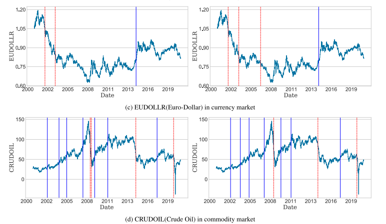 국채 시장에서도 KW-ICSS가 보다 강건한 변화점 탐지를 수행함을 보임 - 통화 시장(EUDOLLR): AIT-ICSS에서는 3개였으나, KW-ICSS에서는 4개로 증가, 단 2007년경 추가된 CP는 하락 추세(빨간 점선)를 정확히 탐지함, 즉 과대 탐지는 아님.