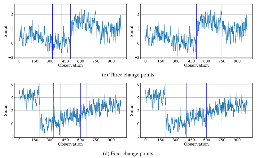 - 시뮬레이션 데이터(길이 1000, 5000, 10,000)에서 변화점 탐지 수행
