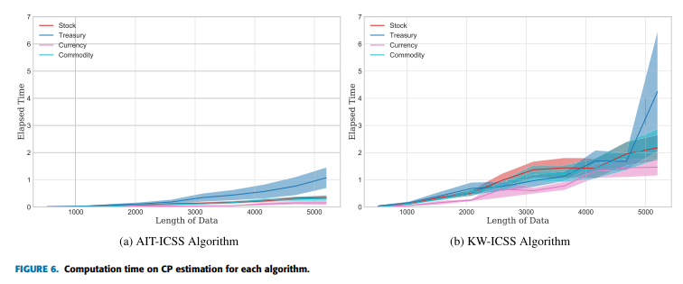 으로 나타났다. 즉, AIT-ICSS는 데이터 포인트가 5000개(약 20년치 데이터)여도 평균 1초 미만으로 CP 탐지를 수행 KW-ICSS는 동일한 데이터 길이에서 평균 약 4초 소요, 최대 6초까지 증가 가능함을 보였고, 대략적으로 금융 시계열에서 KW-ICSS가 AIT-ICSS보다 약 4배 더 긴 연산 시간을 요구함을 확인 가능했다.
