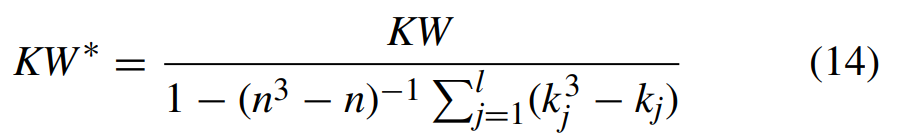 데이터 내의 동일한 값(tie)가 다수 존재하는 경우 다음과 같이 변형된 KW 통계량을 사용할 수 있다.