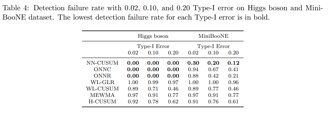 또한, 탐지 절차가 변화점을 감지하지 못하는 빈도를 평가하기 위해 탐지 실패율(detection failure rate)을 계산하였다. 이때 탐지 실패율은 위에서 정의한 사건이 발생하는 빈도로 정의된다.표 4는 Higgs boson 데이터셋에서 제1종 오류 {0.02, 0.10, 0.20}에 대한 NN-CUSUM과 기존 방법들의 탐지 실패율을 보여준다. NN-CUSUM, ONNC, ONNR은 모든 제1종 오류 값에서 0의 탐지 실패율을 달성했다.