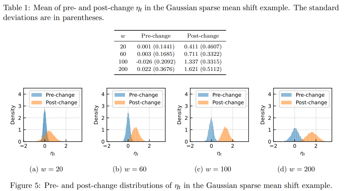 표 1은 변화 이전(pre-change)과 변화 이후(post-change)에서의 ηt의 시간적 평균(temporal mean)을 보여준다. 윈도우 크기 w=20 일 때부터 변화 이후(post-change)의 기대 ηt가 양수가 되며, 윈도우 크기가 증가할수록 ηt의 크기가 더 커진다.
