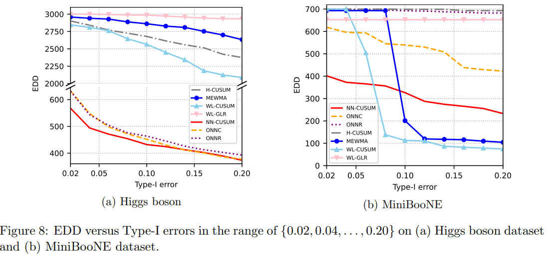 그림 8a는 Higgs boson 데이터셋에서 NN-CUSUM과 기존 방법들의 평균 탐지 지연(EDD)과 다양한 제1종 오류(Type-I error) 간의 관계를 보여준다. 제1종 오류 값은 {0.02, 0.04, …, 0.18, 0.20}에서 선택되고. 그 결과 NN-CUSUM이 제1종 오류가 {0.02, …, 0.12} 범위에 있을 때 모든 다른 기존 방법들보다 일관되게 우수한 성능을 보인다는 것을 확인했다.