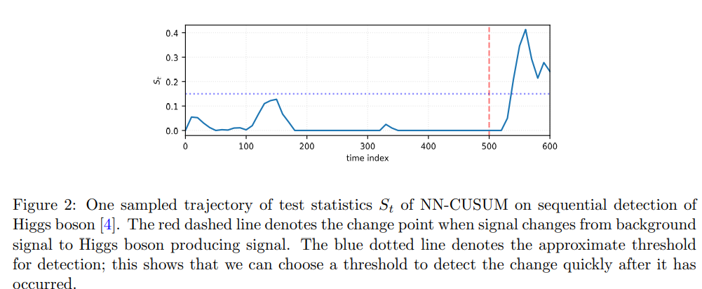 위의 Fig 2는 힉스 보존(Higgs boson) 신호의 순차적 탐지에서 NN-CUSUM 테스트 통계량 St의 샘플 궤적을 보여준다. 이는 빨간색 점선에 해당하는 change point를 적절한 임계값을 통해 잘 감지하면 변화가 발생한 직후 신속하게 탐지할 수 있음을 보여준다.