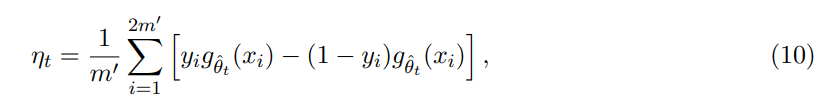 로짓 손실의 선형화된 버전(linearized version of the logit loss)은 MMD 검정 통계량(MMD test statistic) [7]을 참고하여 아래와 같이 정의된다.