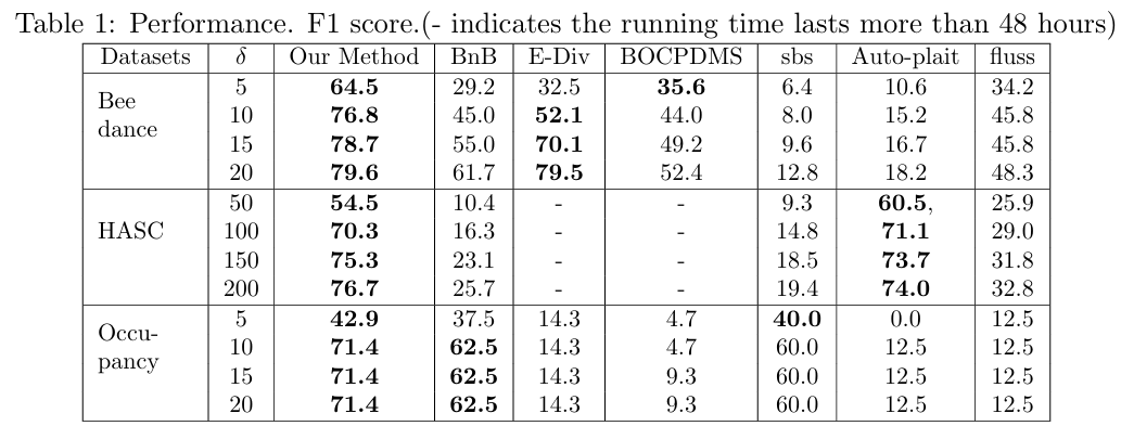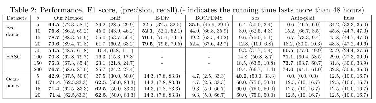 BNB, E-Divisive, BOCPDMS, SBS, Autoplait, Fluss와 비교만 수행하였음, 이는 (a) 다중 변화점(k > 1)을 처리하지 못했거나, (b) 가장 작은 실제 데이터 세트에서도 실행 시간이 너무 길었거나, (c) 두 가지 문제를 모두 가지고 있었기 때문입니다.