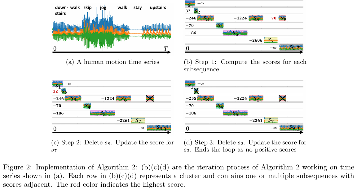 예를 들어 Fig2(b)를 보면 인간 동작 데이터의 클러스터링에서 두개의 walking state의 일부 타임스탬프가 동일한 클러스터에 속한 것을 확인 가능하다(각 열이 클러스터를 의미하고 특히, 세 번째 클러스터(그림 2(b)-(d)에서 세 번째 행)는 subsequence s3,s6,s8로 구성되며, s3 과 s 은 걷기(walking) 동작에 해당하고, s8 은 의미 없는(spurious) 구간)