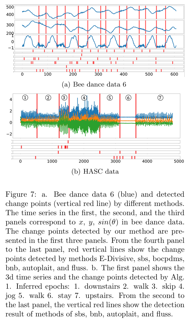 - Bee dance (Oh et al., 2008): The time series corresponds to bee movement trajectories captured by the camera. We used six time series, each with dimension d = 3 and with an average time length T ≈ 600. Fig. 7(a) shows an example time series. Each timestamp is labeled with one of the states: turn right, turn left, and waggling. The change points are timestamps when the state transition occurs.