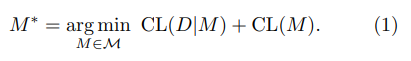이는 일반적으로 negative log likelihood로 측정(cf: entropy 개념)된다. 또한 모델 M 자체를 인코딩하는 데 필요한 CL(M) 또한 정의 가능하다. 따라서 우리는 이 둘의 합을 CL(D, M)으로 정의하며 best model을 해당 CL(D, M)의 argmin으로 정의한다.