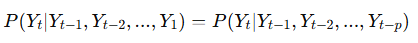 과거 p의 history(즉 바로 직전 0에서 그 이전 p까지의)에 대해 조건부로 주어진 시계열의 joint distribution은 아래와 같이 표현가능하다.