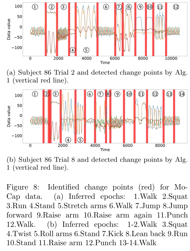 - MoCap: Human motion sensor data1. We used two time series, each with dimension d = 4 and an average time length T ≈ 11,000. Fig. 8 shows the two time series. The dataset does not have labeled ground truth. Instead, it provides recorded videos of the participant’s motions. We examine the video to check whether the change points identified by Alg. 1 is meaningful or not.