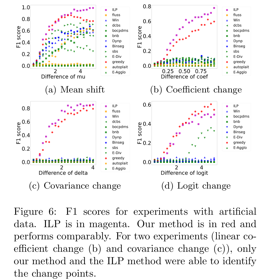 Fig 6은 인공 데이터를 사용한 실험에서의 F1 score를 보여준다. 각 하위 크래프는 두 epoch ϕ1과 ϕ2 사이의 파라미터 벡터간 다른 변화 유형( (a) Mean shift, (b) Coefficient change, (c) Covariance change, (d) Logit change) 별 결과를 보인다.